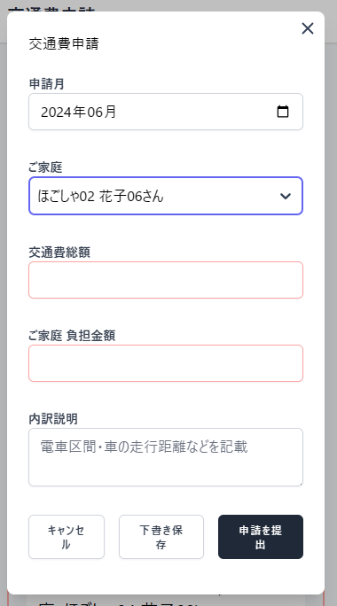 先生は、月末または翌月の月初に、ご家庭から交通費を受領した際に交通費申請を作成し、ご家庭から承認をいただいてください。